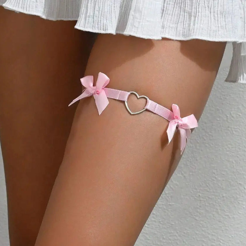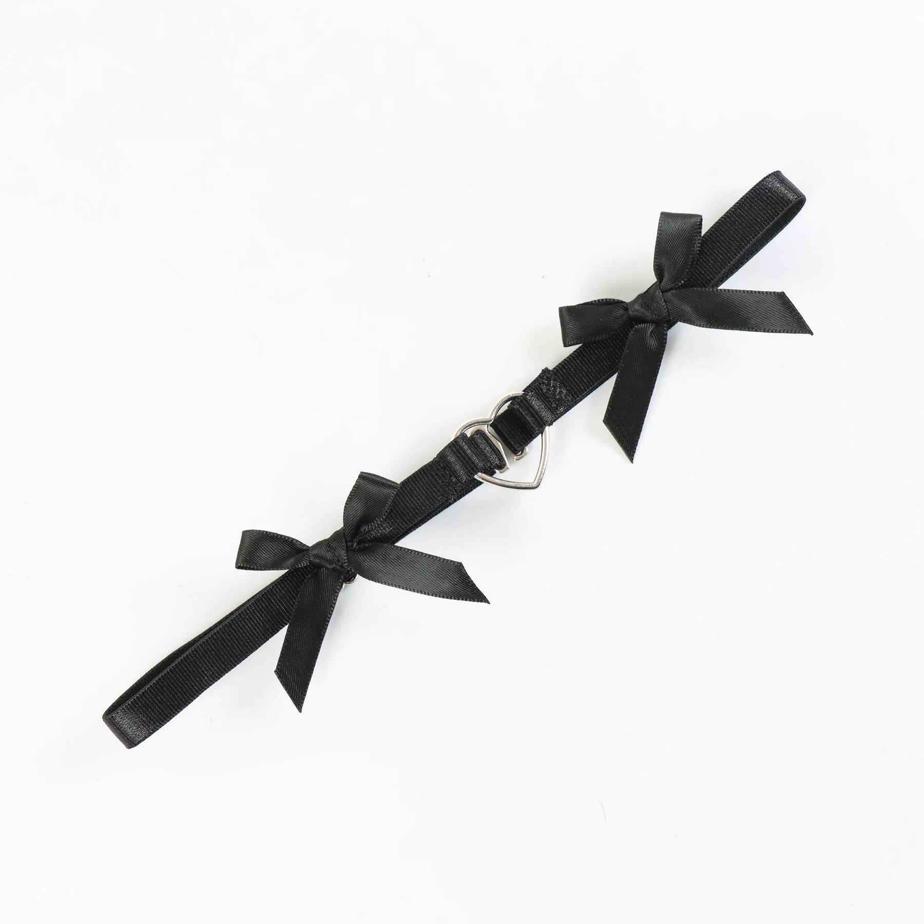 Podwiązka na udo wykonana z czarnej tasiemki ozdobiona dwiema małymi kokardkami i metalowym serduszkiem pośrodku. Dodaje kobiecego uroku i idealnie sprawdzi się jako zmysłowy dodatek do bielizny lub na specjalne okazje.