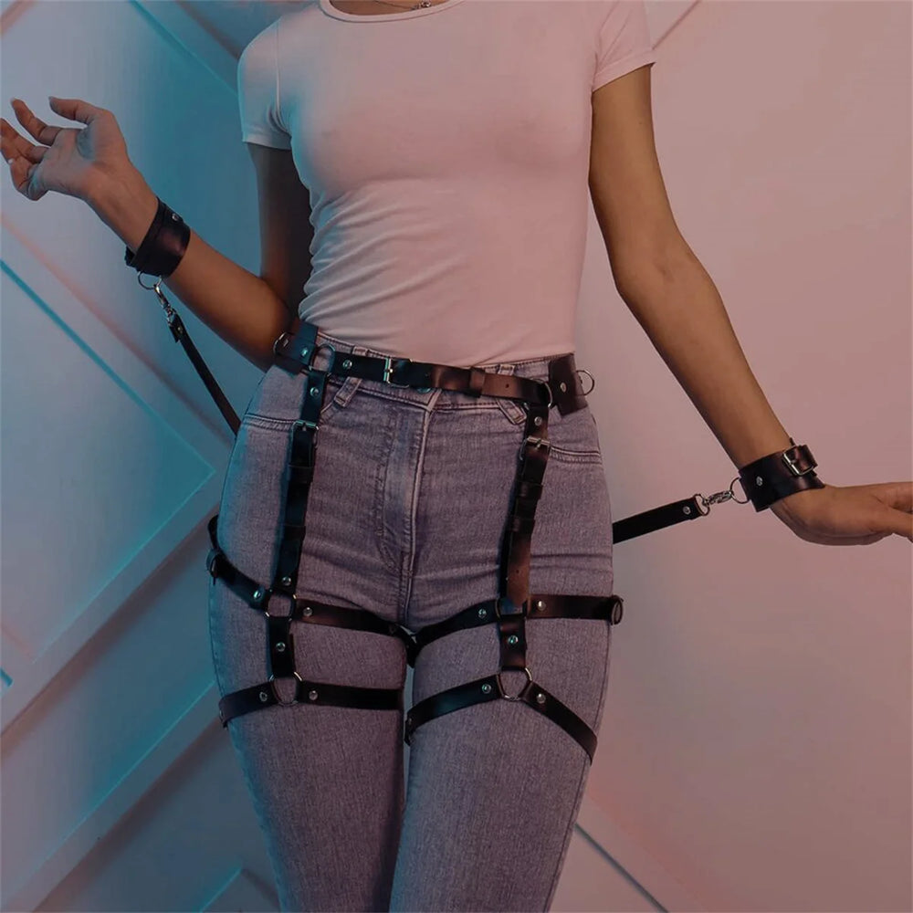 Dolny harness nakładany na biodra i uda to zmysłowy i odważny dodatek, który podkreśla kształty i dodaje stylizacji drapieżnego charakteru. Paski oplatają biodra i uda, tworząc efektowny, geometryczny wzór. Może być noszony samodzielnie na bieliznę lub jako ekstrawagancki akcent do odważnych stylizacji. Idealny dla osób ceniących niebanalne detale i modowe eksperymenty.