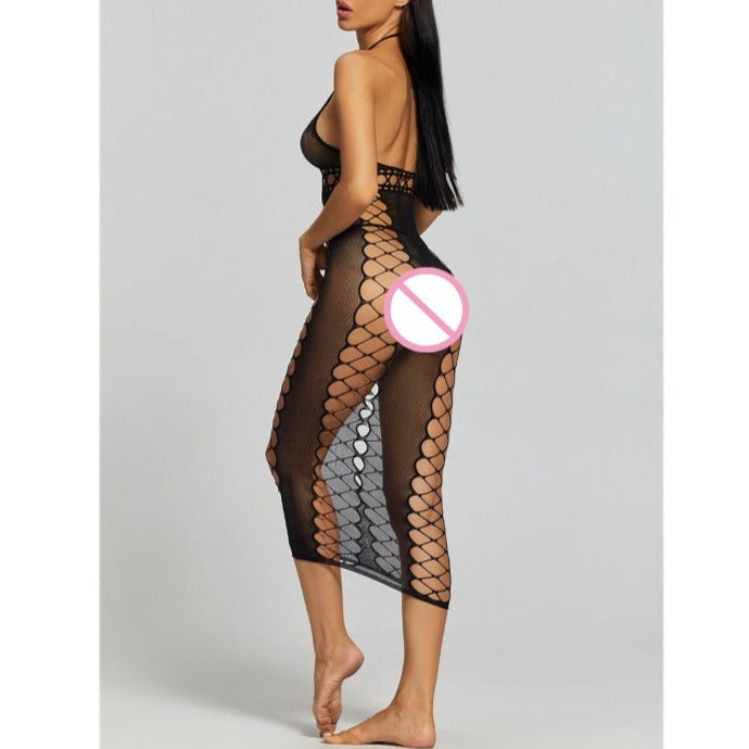 Dłuższa sukienka midi bodystocking z wycięciami to propozycja dla każdej odważnej kobiety. Ta część garderoby wykonana została z elastycznego materiału tak, by jak najlepiej przylegała do ciała. Model został ozdobiony siateczką oraz licznymi wycięciami. Częściowo prześwitujący materiał dodaje stylizacji tajemniczości. Bodystocking to doskonały sposób na zwrócenie na siebie uwagi.