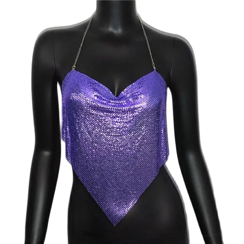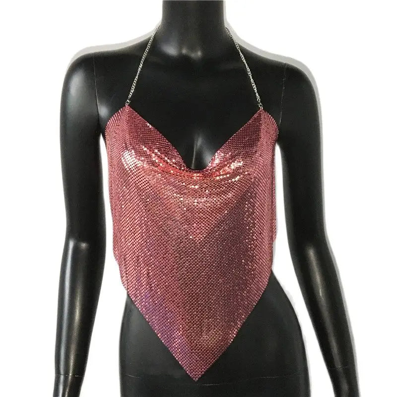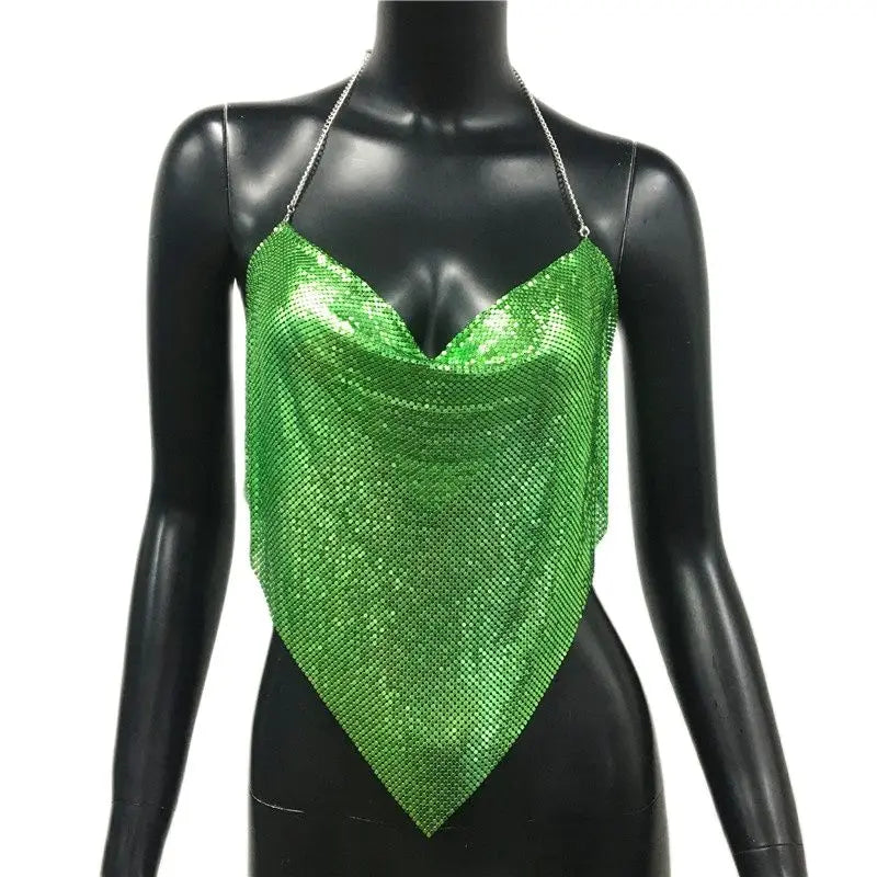 Top wykonany z lekkiej, metalicznej tkaniny pięknie odbija światło i mieni się przy każdym ruchu. Przód ma formę luźno opada i odsłania dekolt co nadaje całości zmysłowego wyglądu. Dół topu zakończony jest w szpic, co dodatkowo wysmukla sylwetkę. Model posiada cienkie, błyszczące ramiączka w postaci łańcuszków. Odkryte plecy sprawiają, że top prezentuje się niezwykle efektownie, a jednocześnie jest idealnym wyborem na wieczorne wyjścia, imprezy czy sesje zdjęciowe. Aż 9 wariantów kolorystycznych!