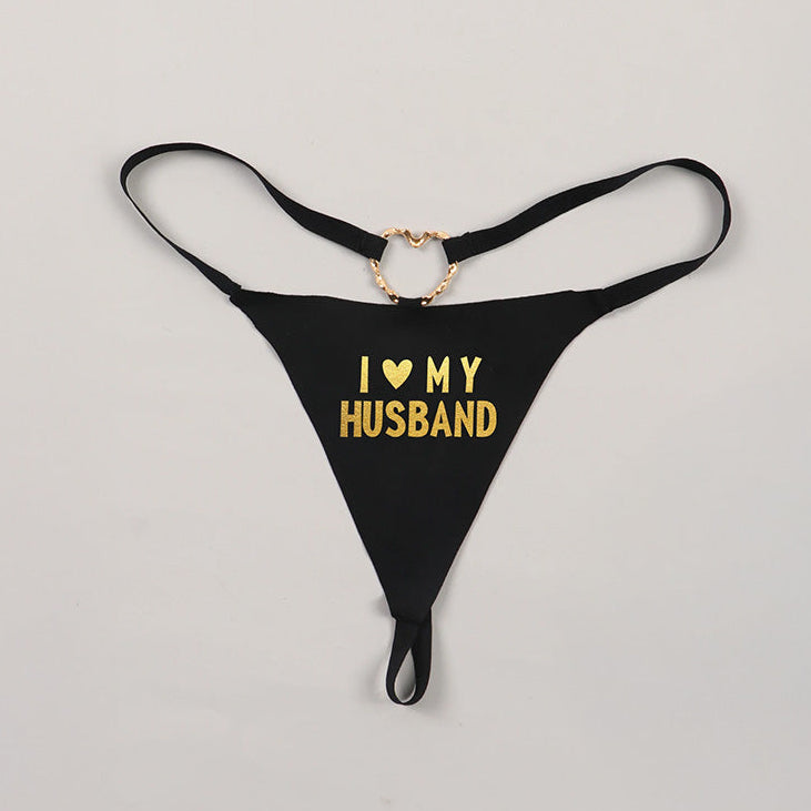 Odważne stringi w kolorze klasycznej czerni z efektownym, złotym nadrukiem „I ❤️ My Husband”. Model ozdobiony złotym serduszkiem z tyłu dodaje całości subtelnego uroku i podkreśla kobiecą sylwetkę. Idealnie dopasowują się do ciała, zapewniając komfort i wygodę noszenia.