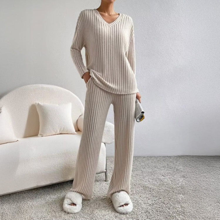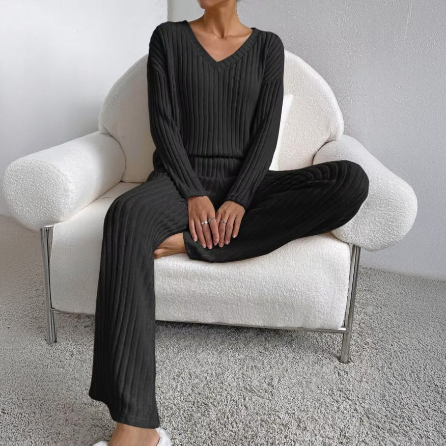 Dwuczęściowy zestaw domowy z prążkowanego materiału to komfort i styl w jednym. Luźny fason zapewnia swobodę ruchów, a miękka tkanina delikatnie otula ciało, idealny na relaks w domu i codzienne chwile wypoczynku. Sprawdzi się również jako komplet na jesienne spacery.