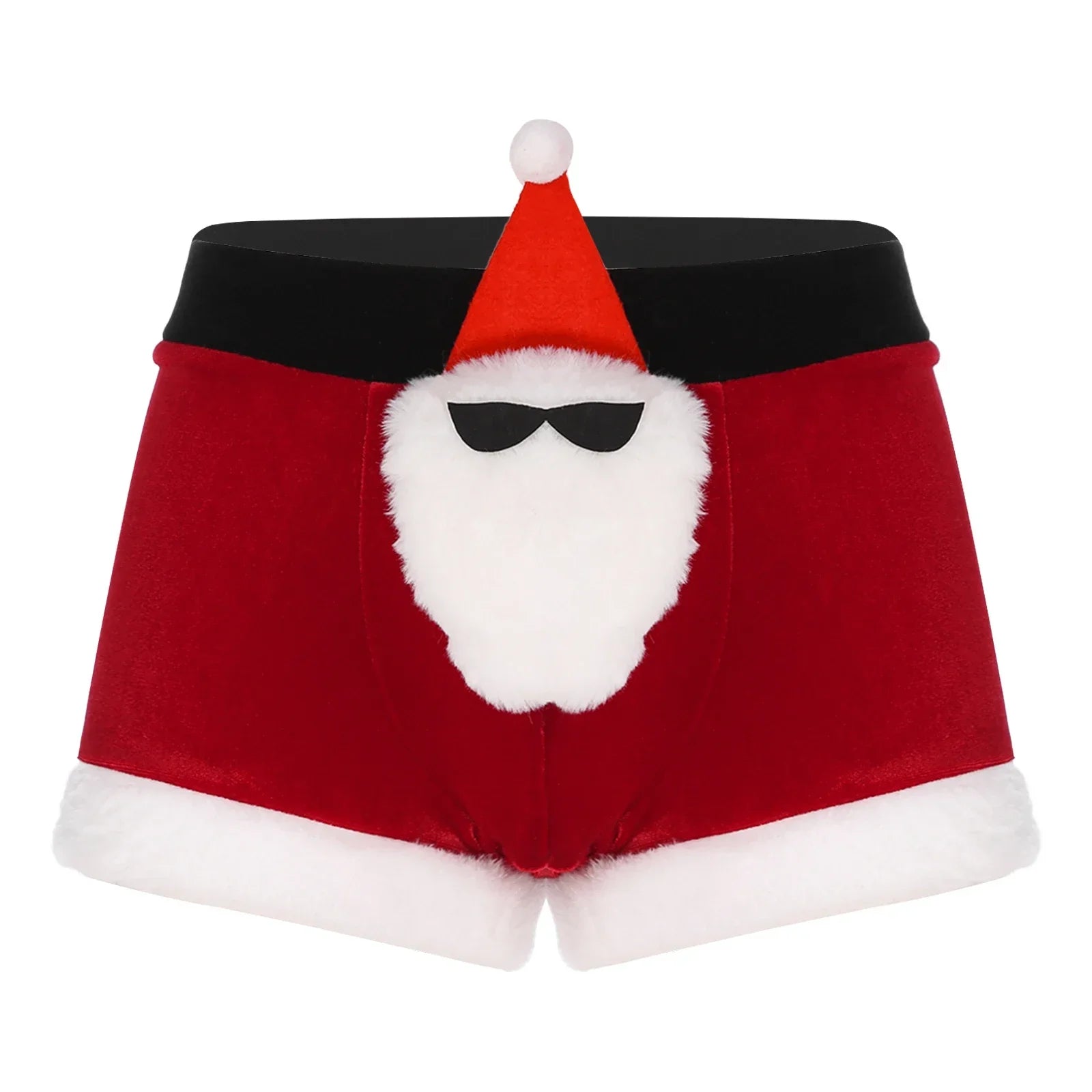 Męskie bokserki w świątecznym stylu, wykonane z miękkiego welurowego materiału. Przód zdobi jeden z czterech motywów świątecznych, np. motyw Mikołaja z czapką, brodą i okularami, który nadaje całości humorystyczny charakter. Idealne na prezent lub jako bielizna na wyjątkowy, świąteczny wieczór!