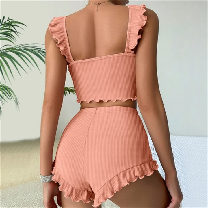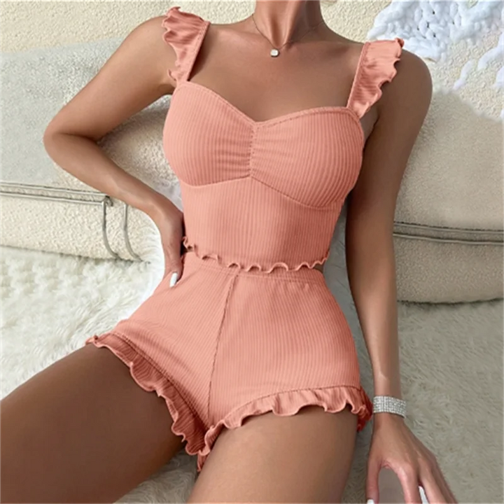 Komplet do spania składa się z dwóch części: topu na ramiączkach i krótkich szortów. Top jest lekki i wykonany z przyjemnego w dotyku materiału, z delikatną falbanką zdobiącą ramiona, co dodaje mu subtelnego uroku. Szorty mają luźny, komfortowy krój z elastycznym paskiem w talii, dzięki czemu nie krępują ruchów. Brzegi nogawek ozdobione są falbanką, która harmonijnie dopełnia całość.