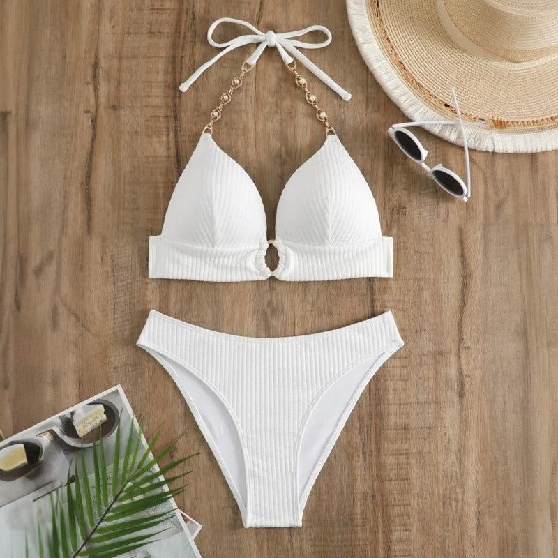 Dwuczęściowy strój z prążkowanym wzorem i ozdobnymi elementami to połączenie elegancji z subtelną zmysłowością. Usztywnione miseczki zapewniają doskonałe wsparcie, a wiązanie na szyi daje możliwość dopasowania. Ozdobny detal między piersiami dodaje uroku i unikalności. Staranne wykonanie i modny design sprawiają, że strój ten wyróżnia się na plaży czy basenie, będąc doskonałą opcją dla tych, którzy pragną połączyć styl z wygodą.