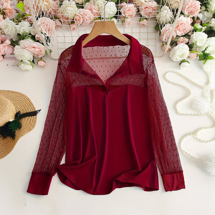 Koszula z tiulowymi rękawami w groszki, która nada Ci lekkości i kobiecego wdzięku. Elegancki kołnierzyk i mankiety dodają szyku, dzięki czemu świetnie sprawdzi się zarówno na wieczorne wyjścia, jak i eleganckie spotkania. Transparentne rękawy z delikatnym wzorem kontrastują z gładkim materiałem, tworząc wyjątkową i stylową całość.