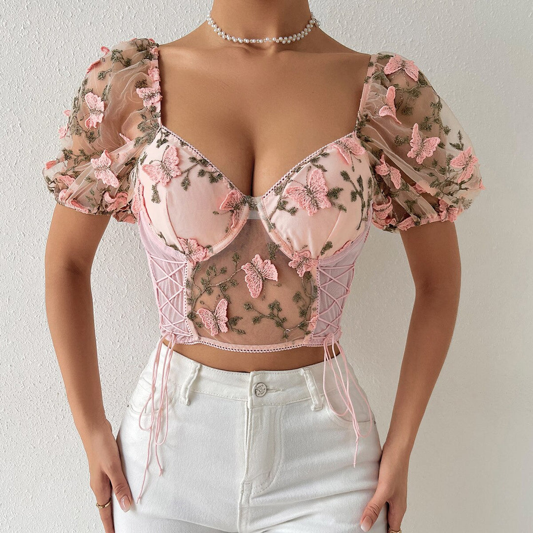 Damski top z kwiatowym haftem to uroczy i romantyczny element garderoby. Kwiatowy haft dodaje mu delikatności i wdzięku, tworząc piękny wzór. Prześwitujące elementy subtelnie odsłaniają skórę, dodając sukience odrobinę kuszącego uroku. Bufiaste rękawy podkreślają kobiecą sylwetkę zachowując przy tym lekkość i styl. Top doskonale komponuje się ze spódnicami lub spodniami tworząc eleganckie i modne stylizacje. Top jest doskonałym wyborem na letnie wieczory, romantyczne spotkania czy imprezy. Dodaje uroku i wyrafinowania, pozwalając wyrazić swoją kobiecą naturę i piękno.