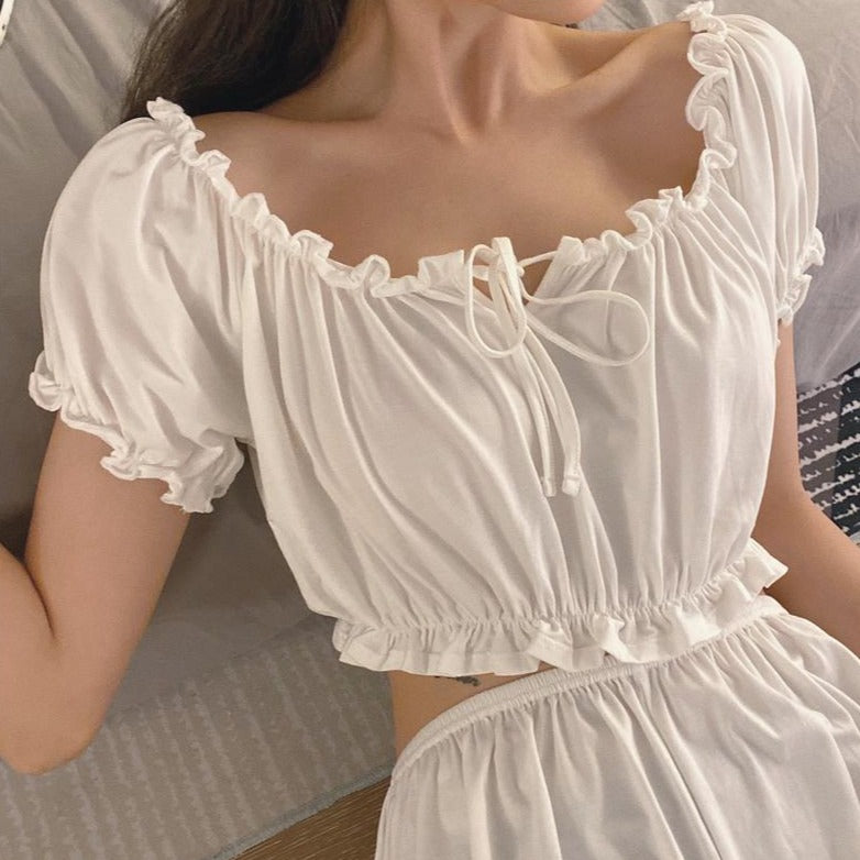 Materiałowy komplet nocny w dwóch kolorach: białym lub fioletowym. Marszczone wykończenie oraz urocze wiązanie nadają zestawowi dziewczęcego charakteru. Elastyczna opaska pozwoli nosić produkt na dwa sposoby: założony na ramiona lub zmysłowo opuszczony. Luźne szorty są także zakończone gumą. Poczujesz się w niej lekko i kobieco. Bluzeczkę możesz także wykorzystywać do letnich stylizacji. W komplecie znajdują się: krótki top oraz szorty.