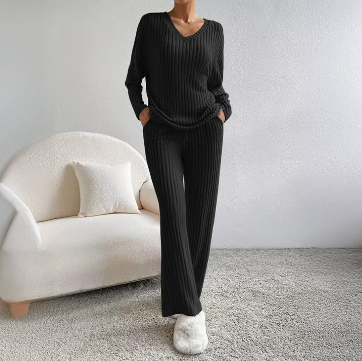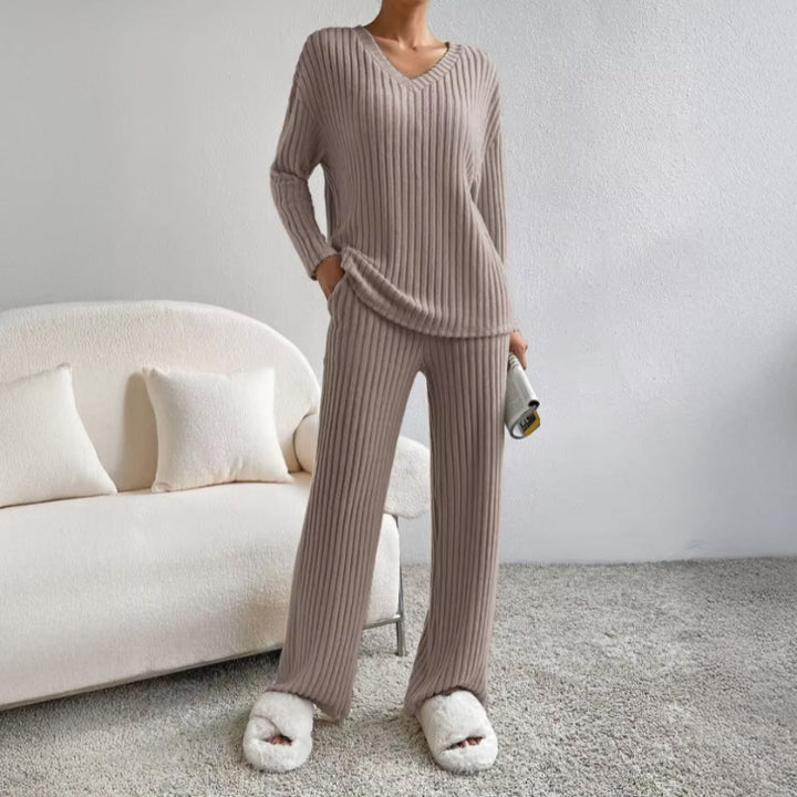 Dwuczęściowy zestaw domowy z prążkowanego materiału to komfort i styl w jednym. Luźny fason zapewnia swobodę ruchów, a miękka tkanina delikatnie otula ciało, idealny na relaks w domu i codzienne chwile wypoczynku. Sprawdzi się również jako komplet na jesienne spacery.