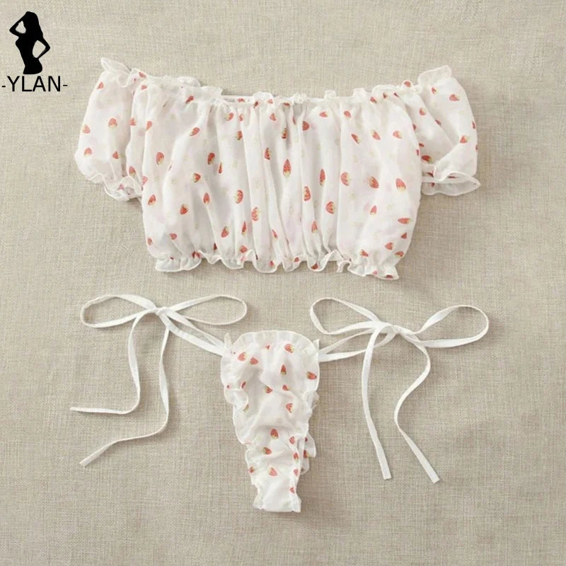 Uroczy komplet bielizny składający się z krótkiego topu i wiązanych stringów. Wykonany z lekkiego, przezroczystego materiału z delikatnym wzorem w małe truskawki. Falbanki i wiązania dodają całości dziewczęcego uroku, a odkryte ramiona i biodra subtelnie podkreślają sylwetkę.