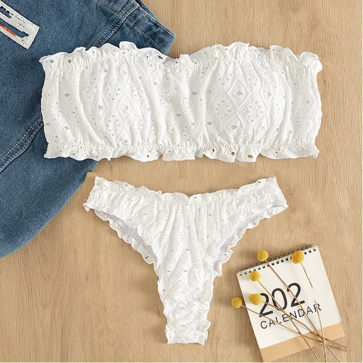 Bikini z falbanką bez ramiączek to zestaw idealny na letnie dni. Górna część bikini wygląda lekko i subtelnie, a jednocześnie dobrze eksponuje ramiona. Dekolt ozdobiony jest delikatną falbanką, która nadaje całości kobiecego uroku. Dolna część bikini, również koronkowa, z prostym stanem, wykończona falbankami. To komplet idealny na plażę lub basen.