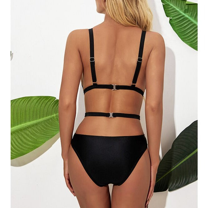 Strój kąpielowy z wycięciami zapinany na dwa wygodne zapięcia. Regulowane ramiączka. Strój kąpielowy wyróżnia się oryginalnym krojem, który podkreśli i uwydatni kobiece kształty. Głęboki dekolt podkreślający biust. Posiada modne wycięcia z przodu oraz na plecach. Wykonany z łączenia materiałów - szybkoschnący materiał połączony z prześwitującymi elementami. Strój będzie idealny na plażę jak i na basen.