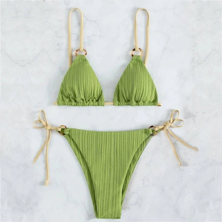 Wakacyjny strój kąpielowy z prążkowanego materiału to stylowa i modna propozycja na plażę lub basen. Wykonany z prążkowanej tkaniny, która dodaje mu tekstury i wyjątkowego wyglądu, pięknie dopasowuje się do sylwetki. Taki materiał jest elastyczny i komfortowy, co zapewnia wygodę i swobodę ruchów. Strój ten może występować w różnych fasonach – od klasycznych bikini po jednoczęściowe modele – idealnie podkreślając letni klimat i dodając charakteru wakacyjnym stylizacjom.