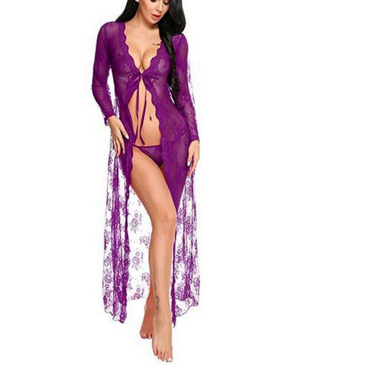 Szlafrok z lekko poszerzanymi rękawami. Dostępny w 8 wariantach kolorystycznych. Zmysłowy model idealnie sprawdzi się jako okrycie podczas wieczorów. Niezwykle kobiecy i zwiewny model. Szlafrok wykonany w całości z koronkowego materiału. Model wiązany jest za pomocą satynowej wstążki pod biustem, jednocześnie podkreśla i ładnie wymodeluje sylwetkę.