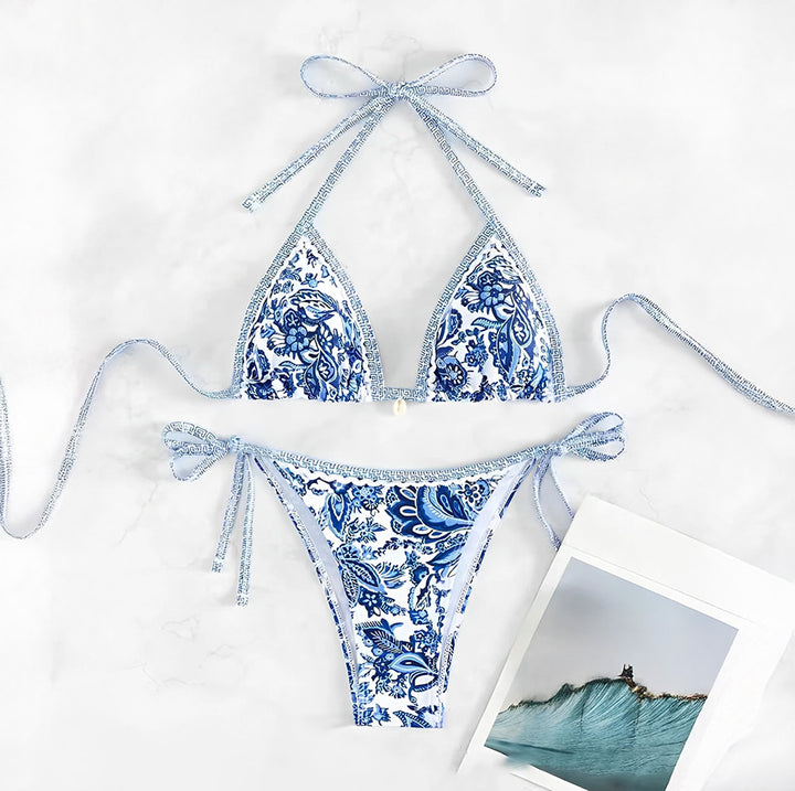 Dwuczęściowy strój kąpielowy z trójkątnymi miseczkami zachwyca kobiecym fasonem i romantycznym, kwiatowym wzorem. Ozdobna muszelka umieszczona między piersiami dodaje egzotycznego uroku. Regulowane wiązania zapewniają idealne dopasowanie i komfort noszenia.