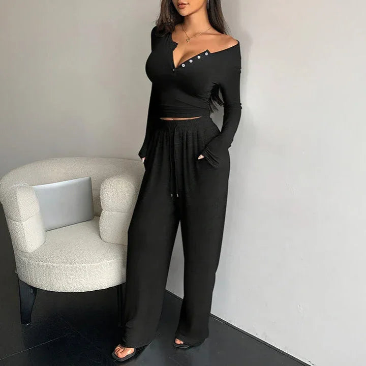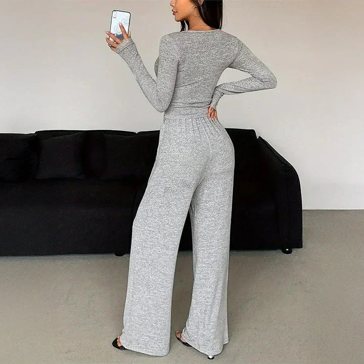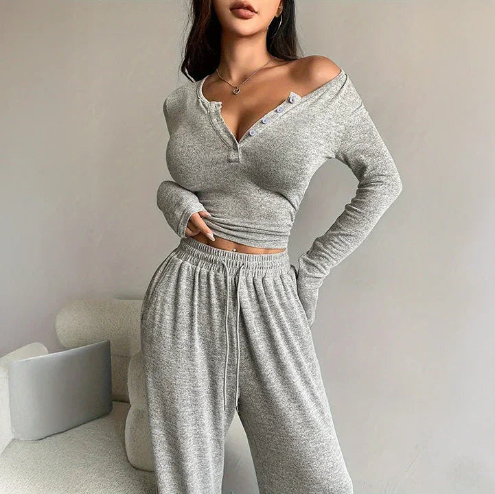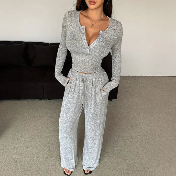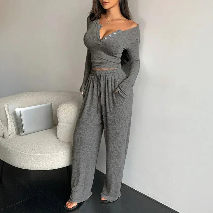 Ten komplet domowy to idealne połączenie wygody i kobiecego stylu. Składa się z dopasowanej bluzki z długim rękawem oraz luźnych spodni z elastycznym pasem. Bluzka z delikatnym dekoltem zapinanym na guziczki subtelnie podkreśla sylwetkę, natomiast spodnie z szerokimi nogawkami zapewniają pełną swobodę ruchów.
