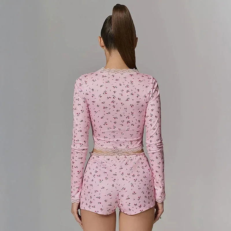 Komplet piżamowy ozdobiony delikatnym kwiatowym wzorem. Składa się z dopasowanej bluzki z długim rękawem zapinanej na guziki oraz krótkich spodenek z elastyczną talią. Koronkowe wykończenia przy dekolcie, rękawach i nogawkach dodają całości subtelnego, romantycznego charakteru.