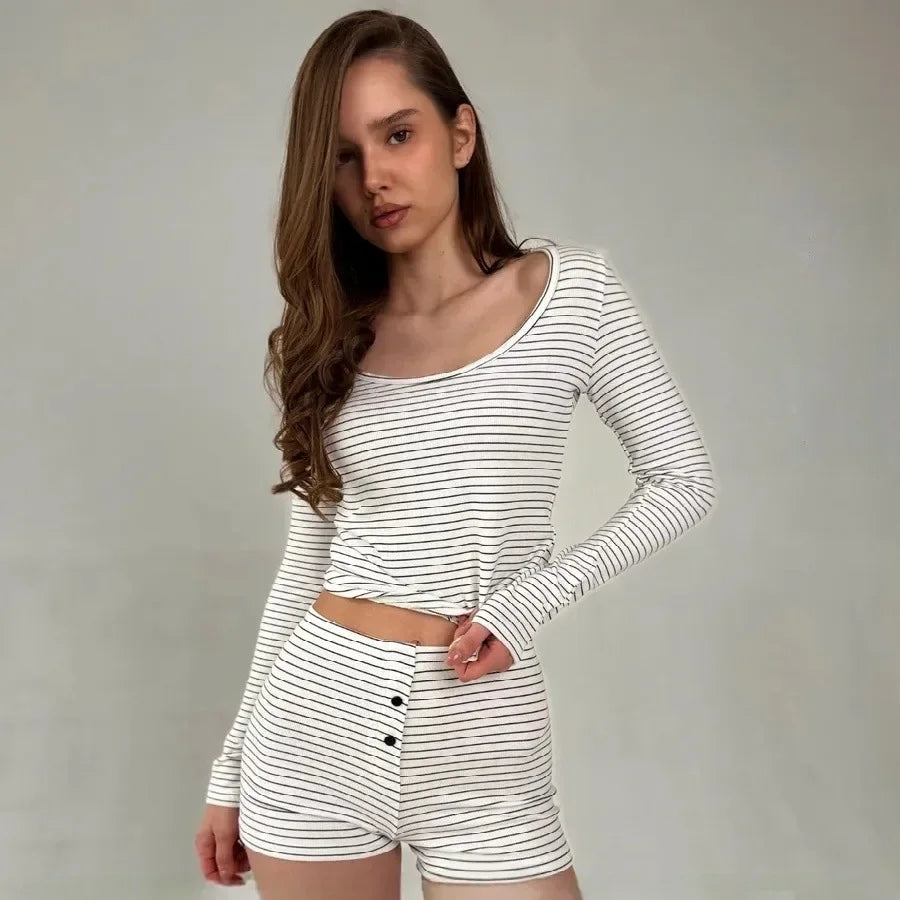 Stylowy i wygodny komplet domowy składa się z dopasowanego topu z długim rękawem oraz krótkich spodenek z wysokim stanem, ozdobionych subtelnymi guzikami z przodu. Idealny wybór dla kobiet, które cenią wygodę połączoną z prostym, ale kobiecym stylem.
