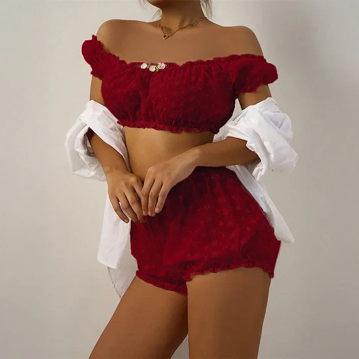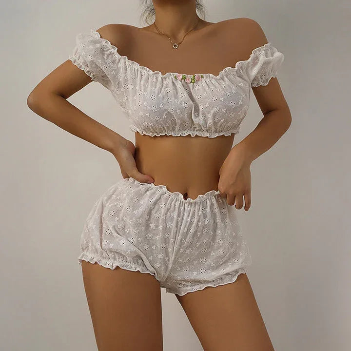 Komplet piżamowy to połączenie romantycznego stylu i wygody. Składa się z krótkiego topu z odkrytymi ramionami i dopasowanymi szortami, które razem tworzą dziewczęcy, lekki zestaw idealny na letnie wieczory lub leniwe poranki w domu. Materiał zdobi subtelny haft w drobne kwiatki,. Jest elastyczny i posiada wykończenie w pasie i przy dekolcie zapewniają doskonałe dopasowanie.