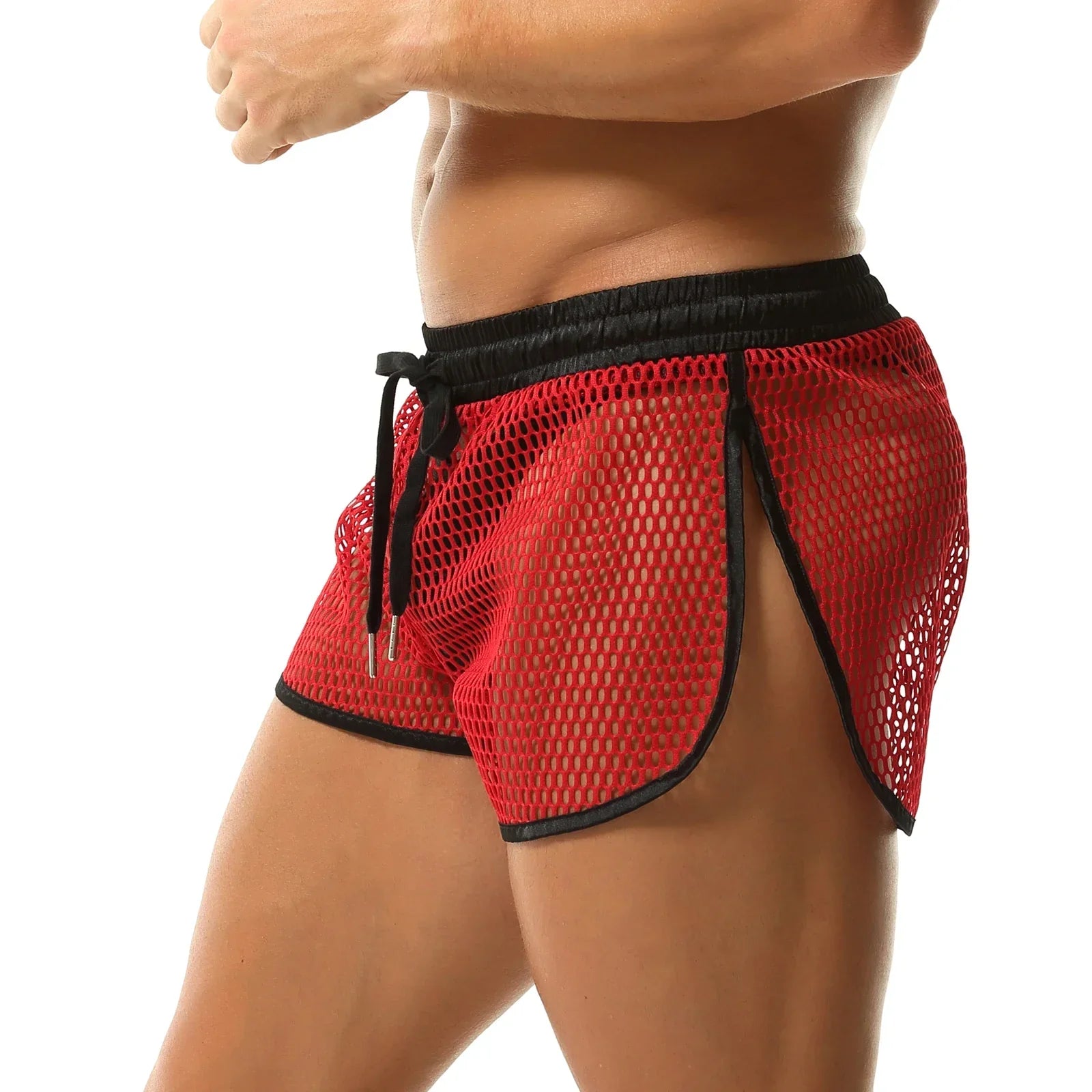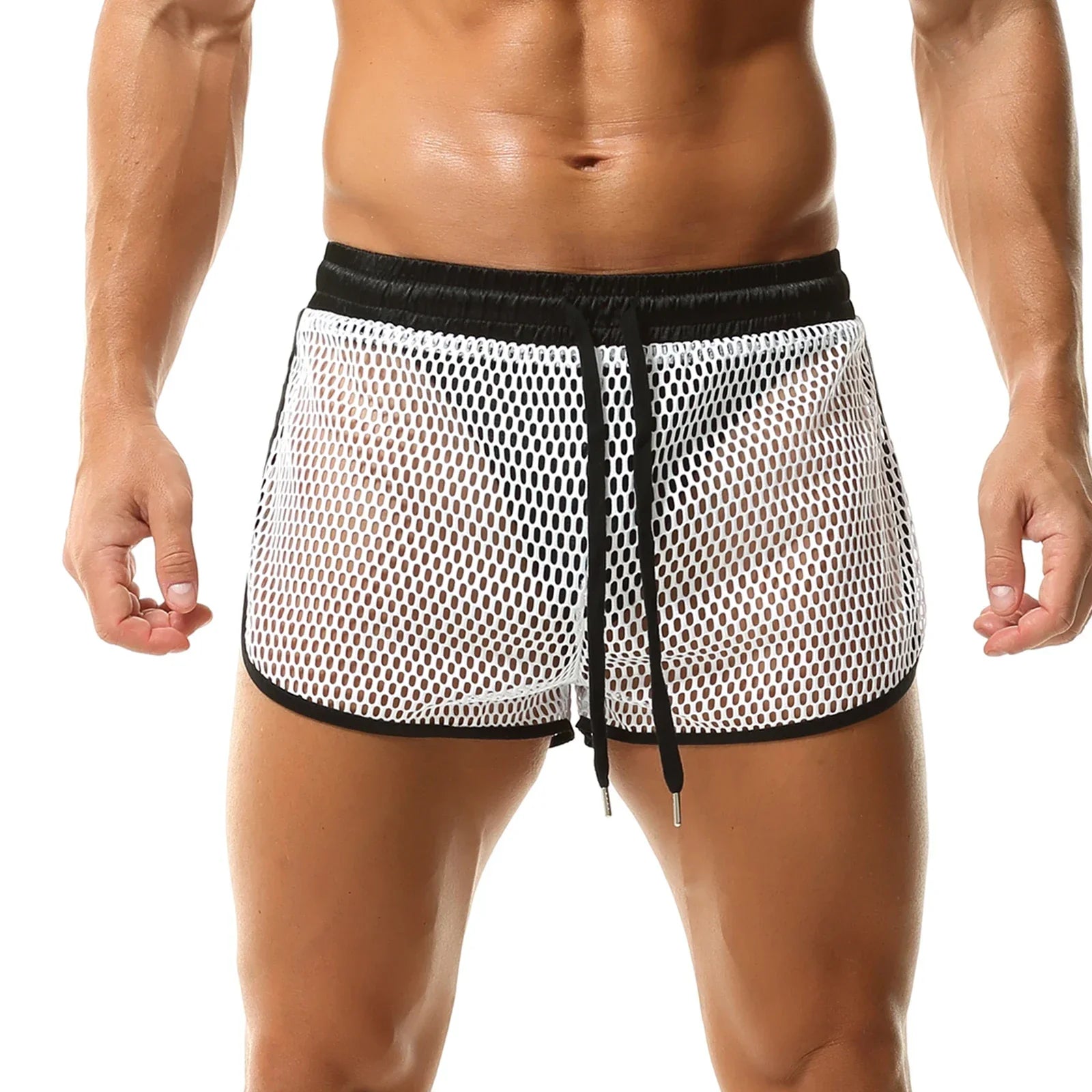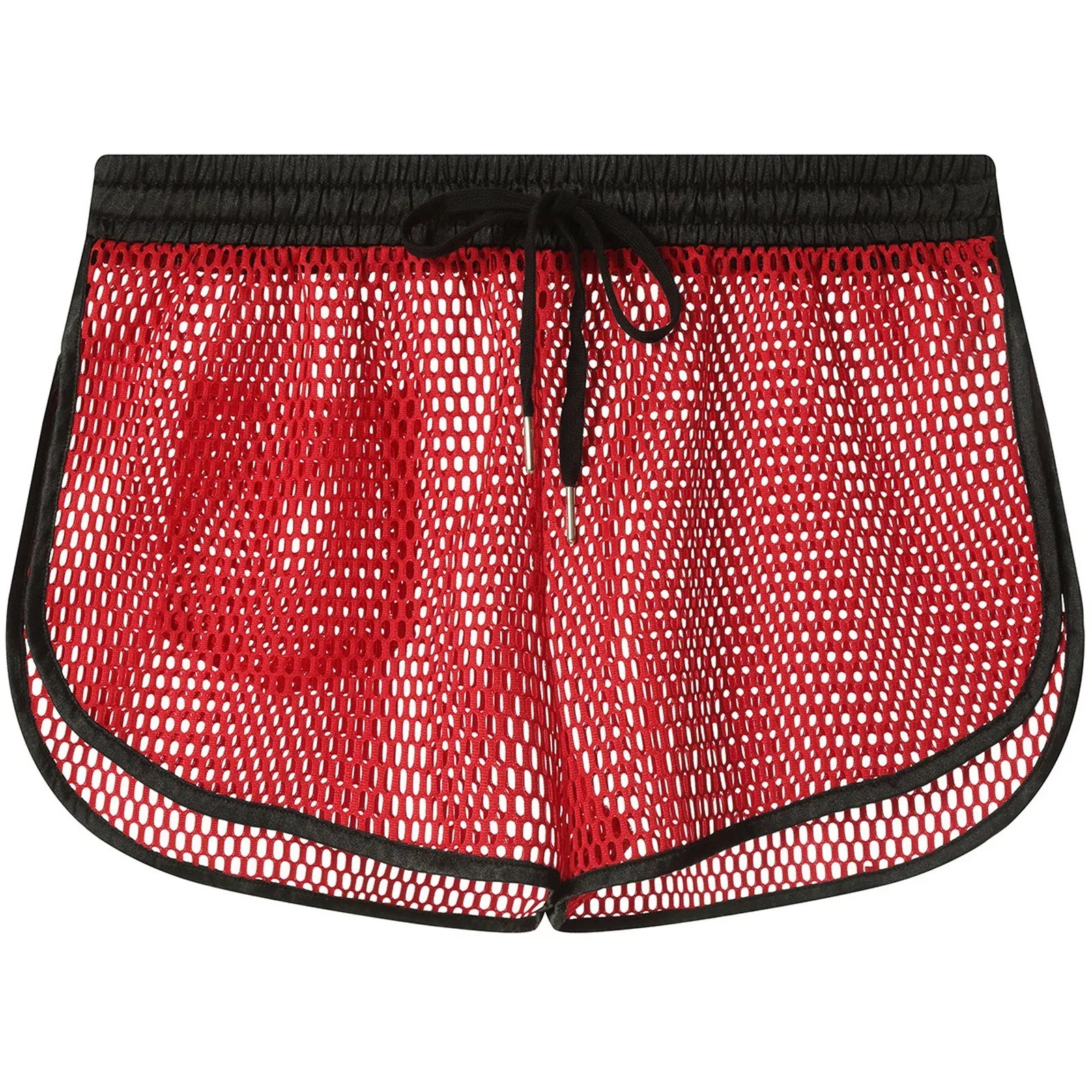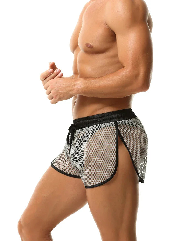 Lekkie i przewiewne szorty męskie wykonane z siateczkowego materiału, idealne na lato lub jako odważny element bielizny. Elastyczny pas ze sznurkiem zapewnia wygodne dopasowanie, a kontrastowa lamówka nadaje całości nowoczesny wygląd.