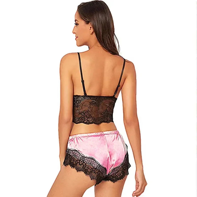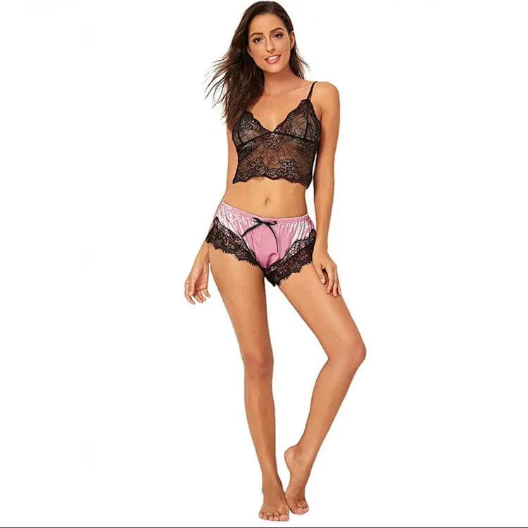 Komplet nocny wykonany z delikatnej satyny i subtelnej koronki to propozycja dla kobiet, które cenią połączenie elegancji i wygody. Piżamka składa się z czarnego, koronkowego topu na cienkich ramiączkach oraz różowych satynowych szortów ozdobionych koronką i wstążką w talii.